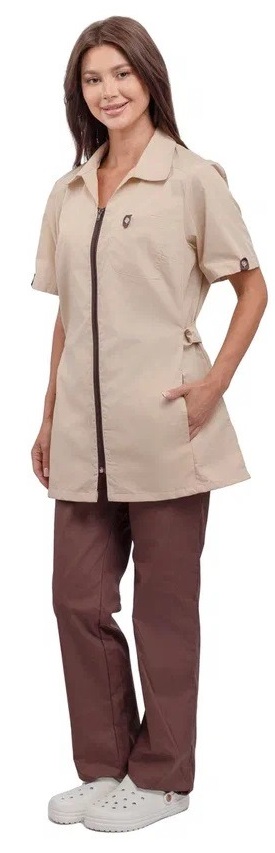 - Костюм состоит из блузы бежевого цвета и брюк коричневого цвета.