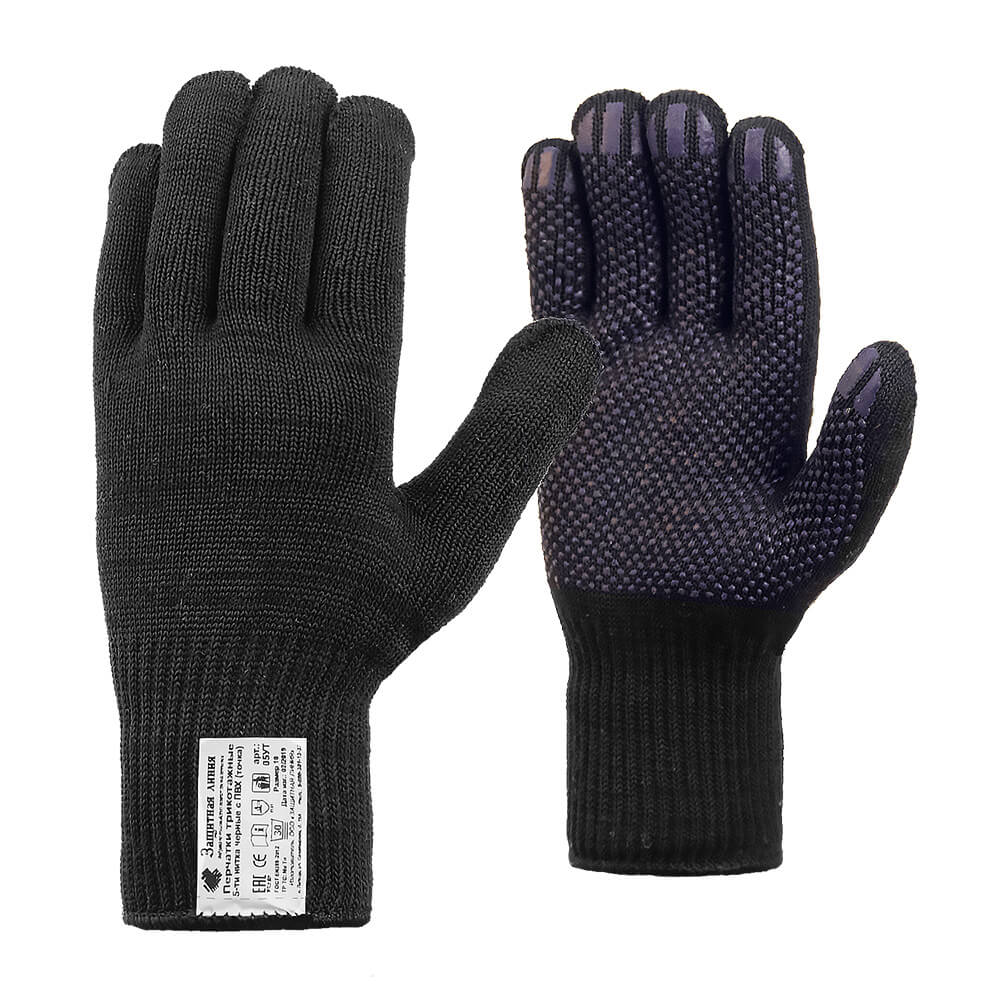 Трикотажные перчатки универсального применения 6-нитка черного цвета повышенной плотности вязки для более надежной защиты. Изготавливаются из х/б пряжи с добавлением прочных и легких синтетических волокон. Специальное точечное ПВХ-покрытие позволяет исключить проскальзывание предметов в руках при приложении физических усилий. Относятся к средствам индивидуальной защиты рук от механических воздействий (порезов, ссадин) и загрязнений. Полностью отвечают требованиям ГОСТ и маркируются, согласно законодательству РФ. К основным преимуществам можно отнести невысокую стоимость, практичность, хорошую воздухопроницаемость. Являются самым распространенным, популярным и востребованным видом перчаток в различных областях деятельности. Применяются при проведении любых видов работ, связанных с физическим трудом. Оптимальны для использования на производствах с невысоким уровнем загрязнений. Бесшовная «дышащая» основа из полиэфира с хлопком с плотностью вязки 10 петель на дюйм. Высокий уровень комфорта и постоянный отвод влаги. Превосходные сцепные свойства и дополнительная стойкость к истиранию. Двойной оверлок - с возможностью пришить маркировку.