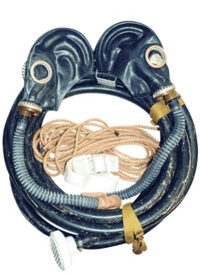 - Противогаз состоит из комплекта лицевых частей, двух соединительных гофрированных трубок, шланга длиной 10 м, фильтрующего элемента для очистки вдыхаемого воздуха от пыли и хлопчатобумажной амуниции. Для хранения и переноски противогаза служит мешок. Амуниция включает в себя спасательный пояс с плечевыми лямками и сигнально-спасательную веревку длиной 12-15 м.